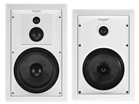Two-way high performance and three-way high performance in-wall mounted speaker systems designed for distributed music